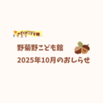2025/09/27 / 最終更新日時 : 2025/10/03 野菊野こども館スタッフ お知らせ 野菊野こども館2025年10月のおしらせ 朝晩涼しい日が増えてきて、お散歩するのに良い季節になってきましたね。野菊野こども館では子どもたちや親子のみなさんが、遊んだりのんびりしたりと、それぞれ楽しい時間を過ごしていますよ。 10月も遊びに来てください♪ < 野菊 […]