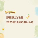 2025/10/25 / 最終更新日時 : 2025/10/25 野菊野こども館スタッフ お知らせ 野菊野こども館2025年11月のおしらせ 肌寒い季節になってきました。季節の変わり目、暖かくして元気に過ごしたいですね。野菊野こども館では子どもたちや親子のみなさんが、遊んだりのんびりしたりと、それぞれ楽しい時間を過ごしていますよ。 11月も遊びに来てください♪ […]