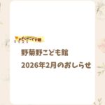 2026/01/27 / 最終更新日時 : 2026/01/27 野菊野こども館スタッフ お知らせ 野菊野こども館2026年2月のおしらせ 寒い日が続いていますね。あたたかくして体調に気をつけたいです。野菊野こども館では子どもたちや親子のみなさんが、遊んだりのんびりしたりと、それぞれ楽しい時間を過ごしていますよ。 2026年2月も野菊野こども館にあそびにきて […]