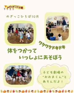 10月「のぎっこひろば」は、子ども劇場の〝おおまくん”が来てくれて『体をつかってワクワクドキドキいっしょにあそぼう』を楽しみましたよ♪♪