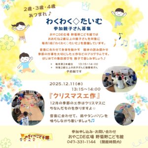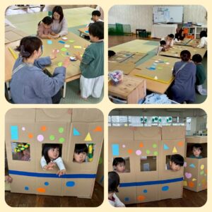 2025/11/19 / 最終更新日時 : 2025/11/19 野菊野こども館スタッフ こども館の様子 わくわく◇たいむ 11月 11月のわくわく◇たいむは「ダンボールハウスと電車」を作りました。 色んな形を貼ったら、とてもステキになりました。 皆んなで小さな街のお家に入ったり、電車に乗って楽しかったね。 次回のわくわく◇たいむは12月11日(木)13:15〜14:00「クリスマス工作」ですよ。お待ちしています。 ※予約制のイベントになります。申込みは野菊野こども館にて直接申込み、またはTEL047-331-1144(開館時間内容)までお願いします。 野菊野こども館ご利用のみなさまへイベントによっては予約が必要なものもありますので、お知らせなどのブログ記事をご覧ください。 こども館の利用には、利用者カードの提出が必要となります。 皆様のご理解ご協力をよろしくお願いいたします。 詳しくは『利用案内』または『お知らせ』をご覧ください。 047-331-1144 受付時間 13:00~18:00[ 火・木・日 ] 10:00~18:00[水・金・土(第1土 休館)]FacebookXBlueskyHatenaCopy