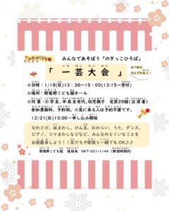 あつまれ、なんでも名人!なわとび、こま、皿まわし、けん玉、歌、ダンス、ピアノ、お笑いなどなど。