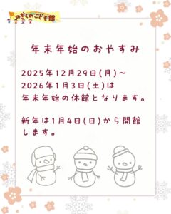 ※2025年12月29日(月)~2026年1月3日(土)は、年末年始の休館となります。新年は1月4日(日)から開館です。