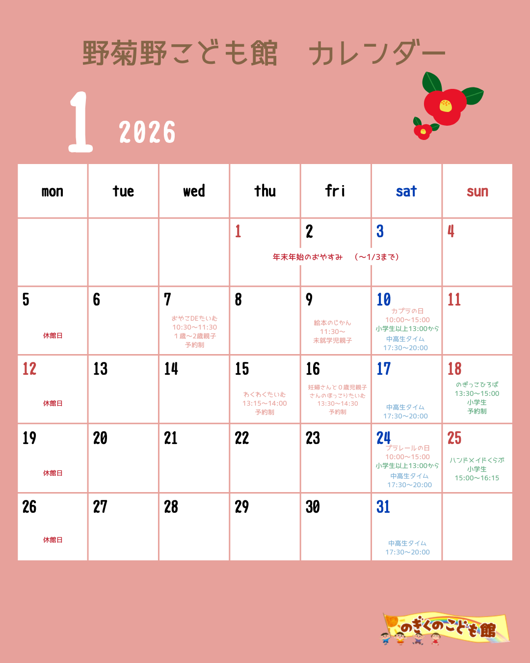 もうすぐ新しい年を迎えようとしていますね。野菊野こども館では子どもたちや親子のみなさんが、遊んだりのんびりしたりと、それぞれ楽しい時間を過ごしていますよ。