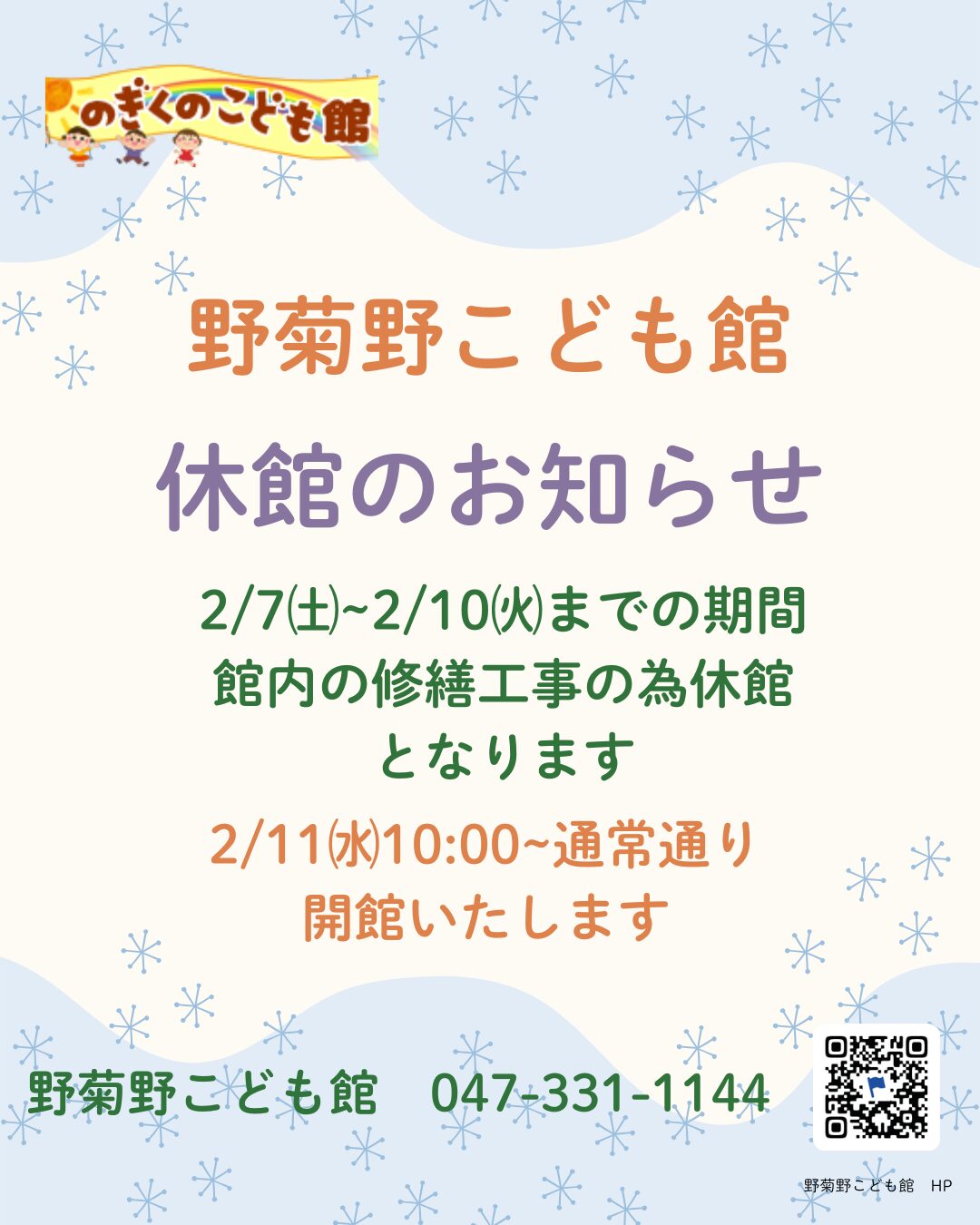 2026年2月7日(土)~2月10日(火)までの期間、野菊野こども館は館内の修繕工事の為 休館となります。