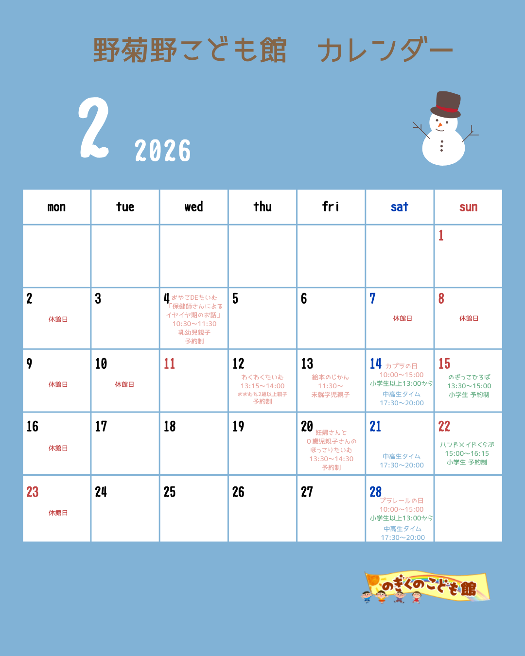 2026年2月も野菊野こども館にあそびにきてください♪