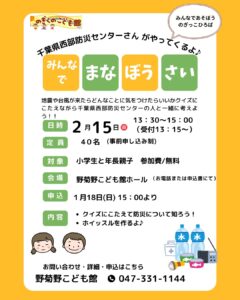 地震や台風が来たらどんなことに気をつけたらいいかクイズをしながら千葉県西部防災センターの人と一緒に考えよう!