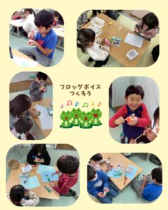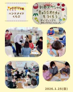 1月の「ハンドメイドくらぶ」は『エコトンボの会』の鬼塚さんと下西さんをお招きして、《ビュンビュンごま》と《フロッグボイス》作りを楽しみました☺
