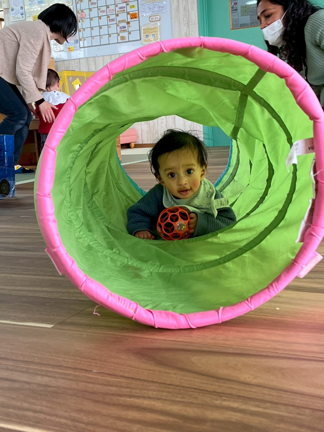 赤ちゃん達は、ながーいトンネルをお友達が潜って行くのをじーと見ていたお子さんが、トンネルの周りを回って、確認して、僕もとチャレンジしていました。