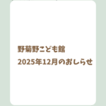 2025/11/25 / 最終更新日時 : 2025/11/25 野菊野こども館スタッフ お知らせ 野菊野こども館2025年12月のおしらせ 公園やいつも通る道など落ち葉が彩る季節になりました。寒い日が増えてきましたね。野菊野こども館では子どもたちや親子のみなさんが、遊んだりのんびりしたりと、それぞれ楽しい時間を過ごしていますよ。 12月も野菊野こども館にあそ […]